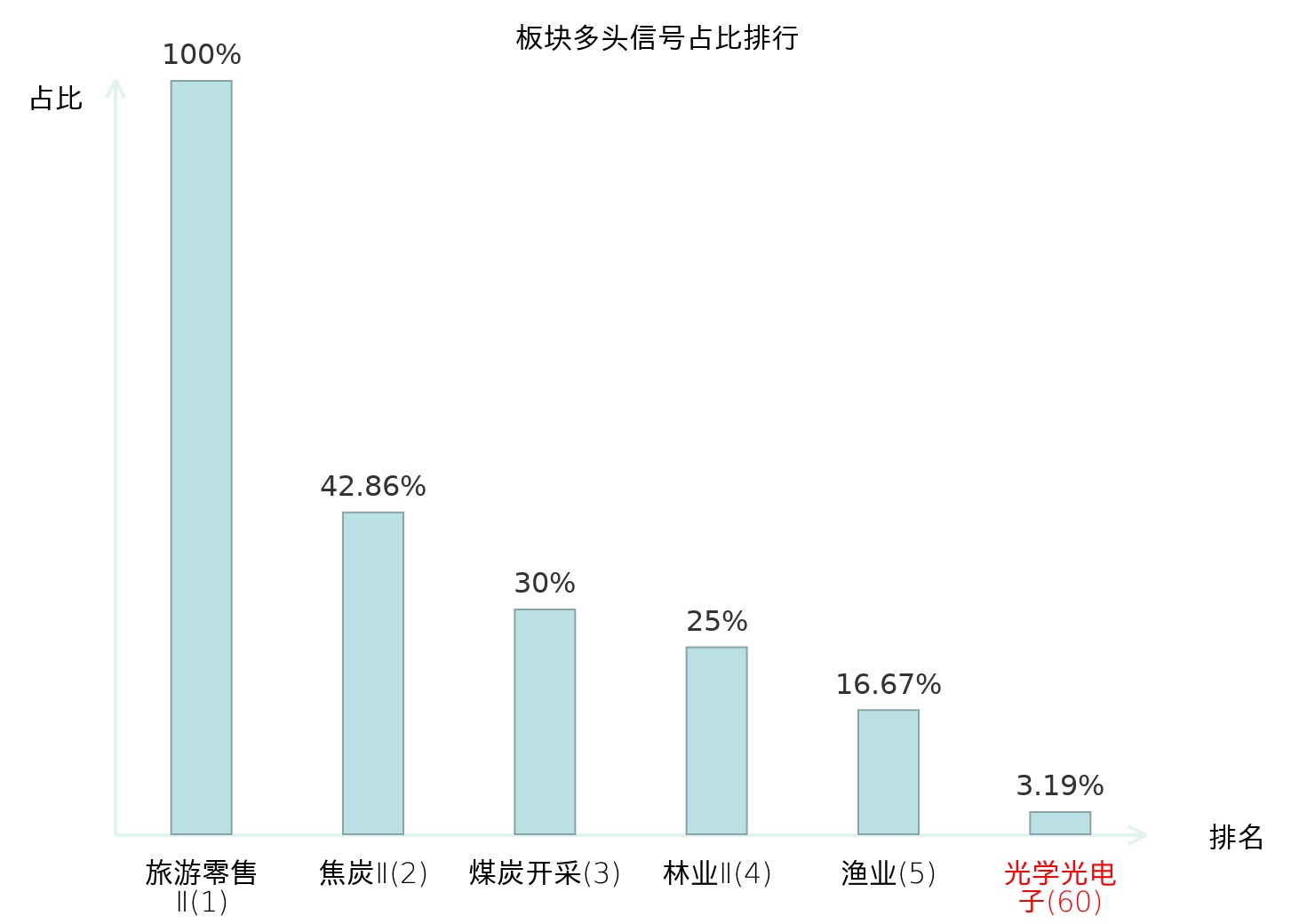 全市场所有行业板块中主力多头信号占比排名中,旅游零售Ⅱ板块位居第一。旅游零售Ⅱ板块名次提升最快,较昨日上升130位。