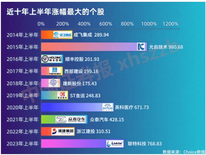 像联特科技这样半年内股价便一飞冲天的个股,近十年来A股还有很多。Choice数据显示,剔除当年新上市新股后,2014年至今,每年上半年涨幅最大的个股分别是成飞集成、光启技术、顺丰控股、西部建设、建新股份、ST金运、英科医疗、众泰汽车、浙江建投、联特科技,这10只大牛股半年度涨幅最低的达到175.43%,最高的达到980.68%。