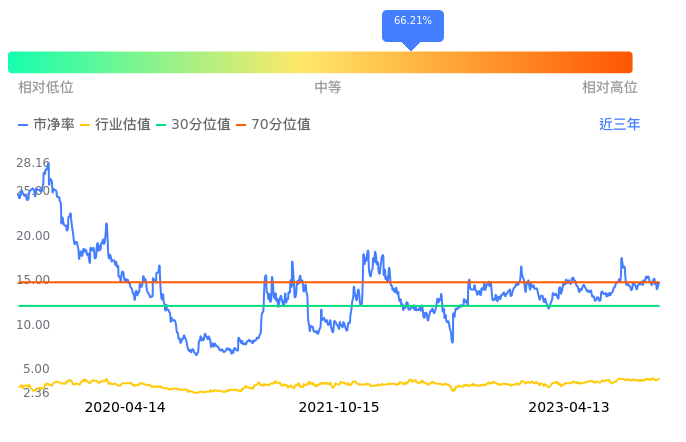 2023年04月13日,金运激光下跌0.84%收于11.81,今日成交金额3701.49万元。下文将从市盈率PETTM、市净率PB、市现率3个角度去分析公司估值情况。