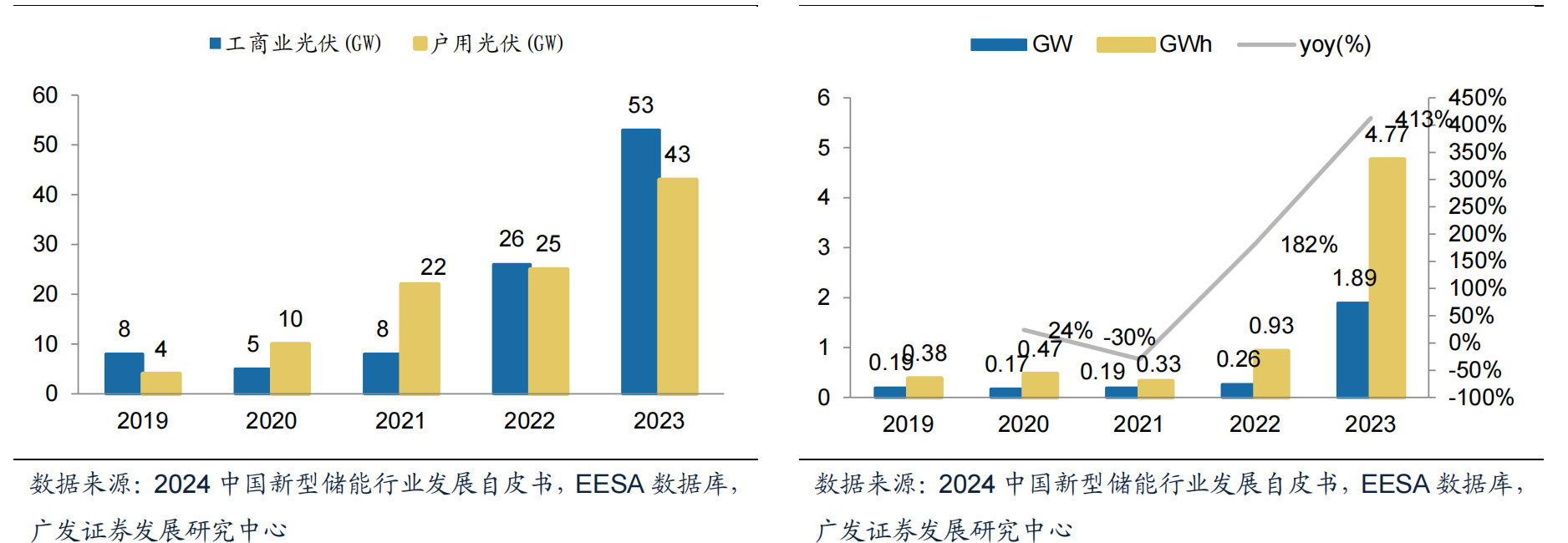 图表5:2019-2023我国分布式光伏新增装机情况(左)2019-2023中国工商业储能新增装机量(右)