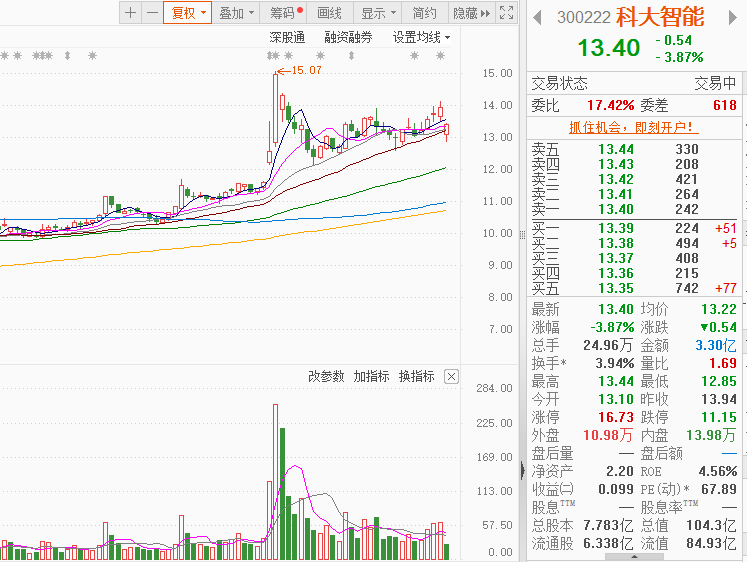 科大智能是智能电网设备和工业机器人概念股,近半年随着数字化能源和智能制造转型的需求井喷,业绩超预期兑现,大幅扭亏转盈,股价顺势上升(优于大市),阶段性底部逐步抬高!当下流通市值80多亿左右且十大流通股东中有众多游资和公私募机构的身影,易炒作;技术面上,前期有快速放量震荡上行,然后回调整理,温和修复上升,各周期均线有支撑且呈多头排列向上,股价有望继续冲高。点击此处立即解锁“启动点“!