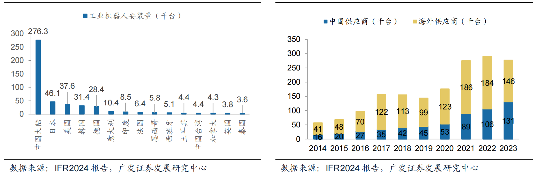 图表6:2023年全球各国机器人安装量(左) 2014-2023年中国工业机器人安装量(右)