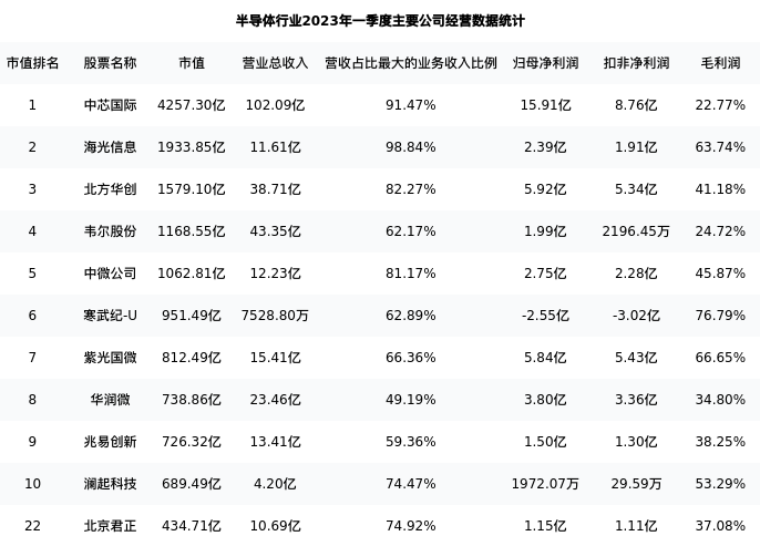 北京君正最新报告期数据为一季度,下表汇总了半导体行业内市值靠前的公司一季度主要经营数据