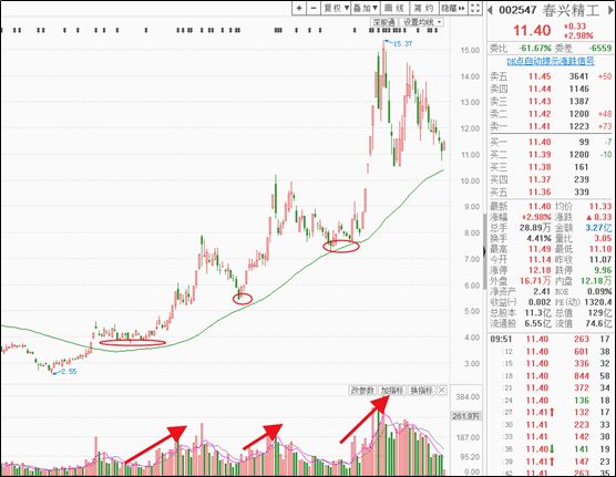 再例如春兴精工阴跌止跌后就是连续阳线拉涨,成交量忽然放出顶天立地的量能,同样属于有主力控盘