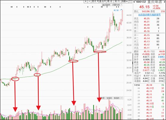 重庆啤酒自从站上60日均线后,一路震荡高走,观察其走势每次回调的位置就在60日均线,一到这里不跌破迅速放量拉升。