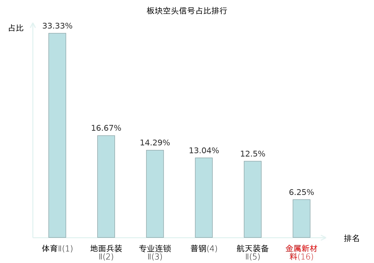 全市场所有行业板块中主力空头信号占比排名中,体育Ⅱ板块位居第一。地面兵装Ⅱ板块名次提升最快,较昨日上升108位。