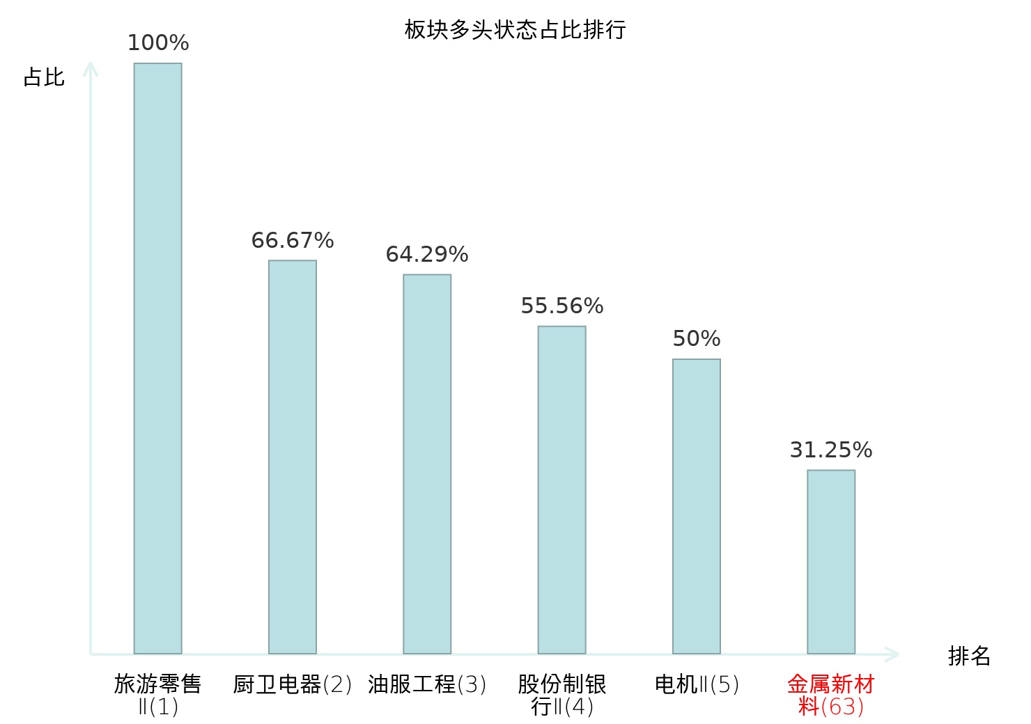 全市场所有行业板块中主力多头状态占比排名中,旅游零售Ⅱ板块位居第一。航海装备Ⅱ板块名次提升最快,较昨日上升78位。
