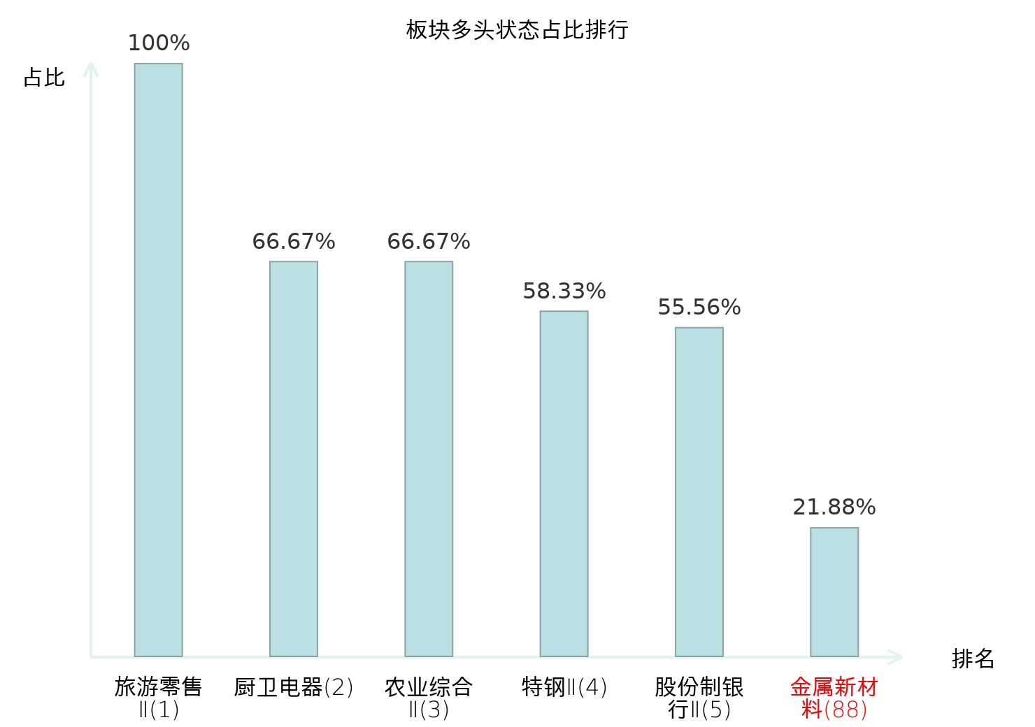 全市场所有行业板块中主力多头状态占比排名中,旅游零售Ⅱ板块位居第一。农商行Ⅱ板块名次提升最快,较昨日上升78位。