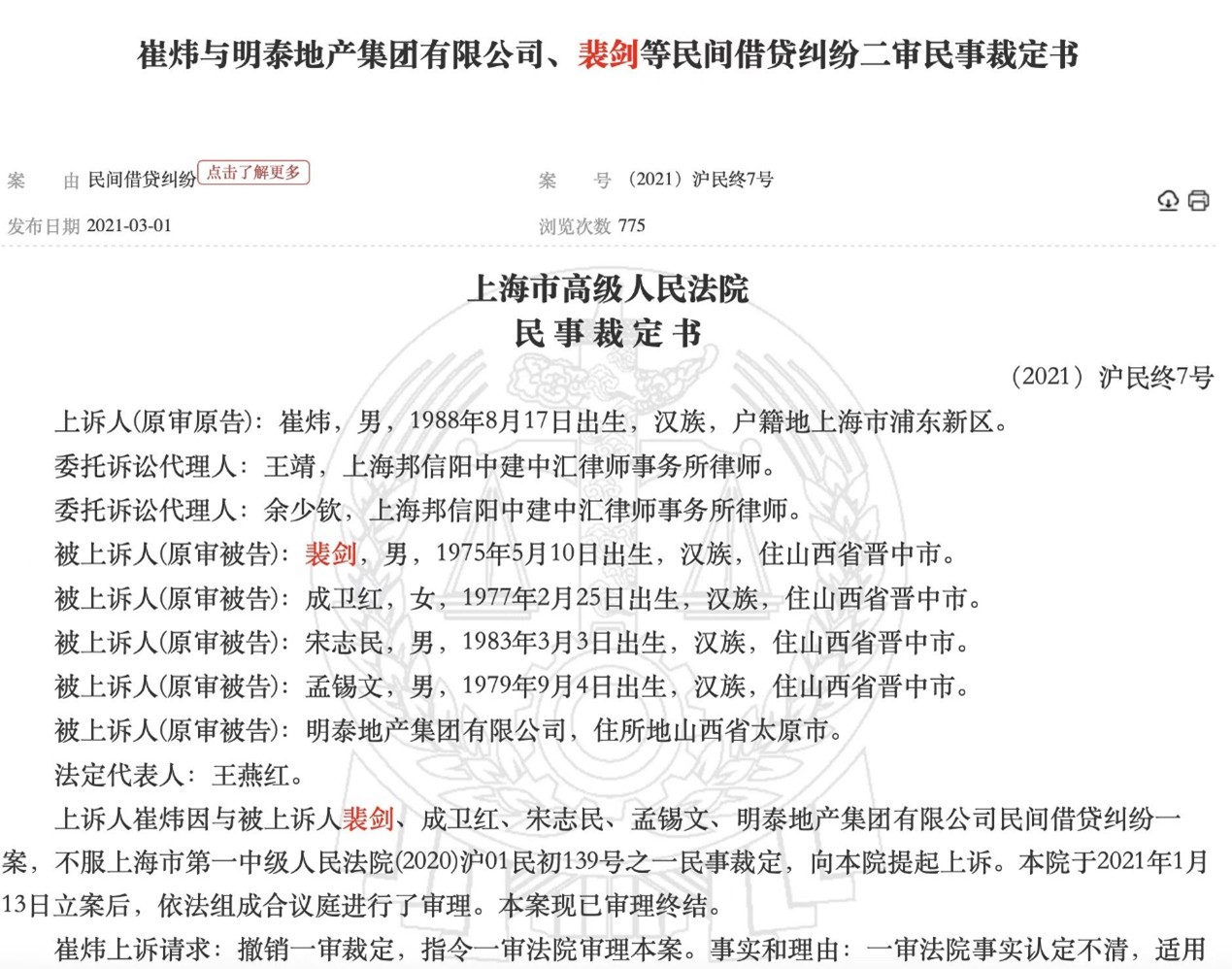 公开信息亦可佐证裴剑与华锦方面的关系。如2021年“贝米钱包案”的相关判决文书(下图)显示,裴剑生于1975年5月,住所在山西晋中,其在该案中被认定为最终的资金流向之一。在上诉请求中,原告要求判令明泰地产对裴剑的债务承担连带担保责任。据天眼查,华锦资产管理有限公司目前的全资股东泱泰旅游投资有限公司与明泰地产法人代表的名字都是杜秀云。华锦资产管理有限公司原系华锦控股集团有限公司旗下企业,宁夏华锦则曾为华锦资产的全资子公司。