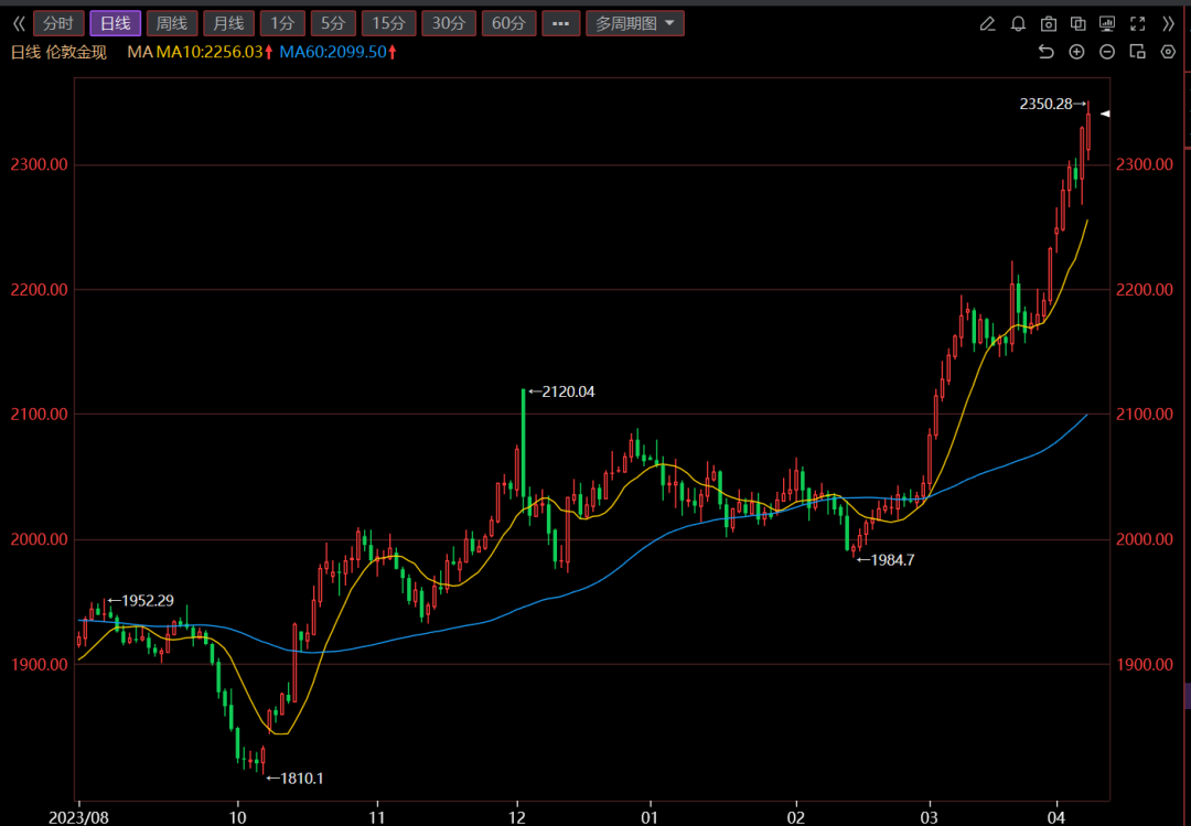 4月8日,伦敦现货黄金突破2350美元/盎司;COMEX黄金报出2372.5美元/盎司的高价;COMEX白银价格也来到28.195美元/盎司。