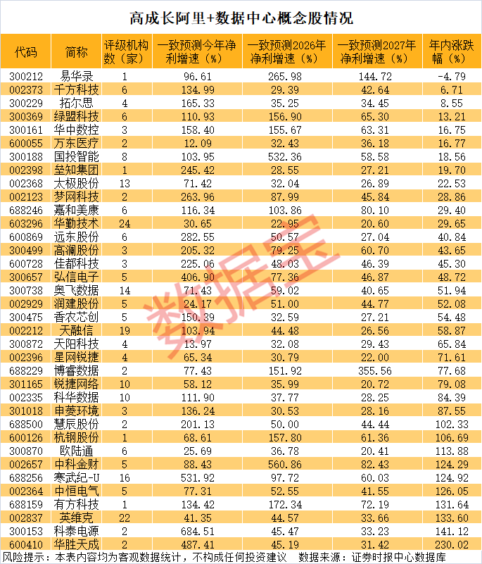 据统计,A股市场上同时有阿里巴巴概念和数据中心概念的个股中,有36股机构一致预测今年、明年及2027年净利增速均超20%。