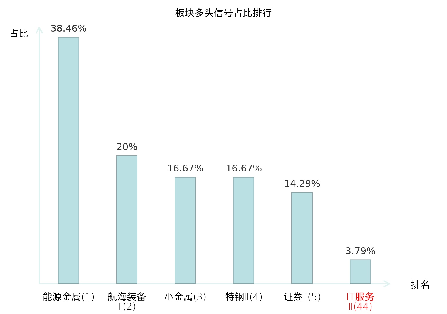 全市场所有行业板块中主力多头信号占比排名中,能源金属板块位居第一。航海装备Ⅱ板块名次提升最快,较昨日上升112位。