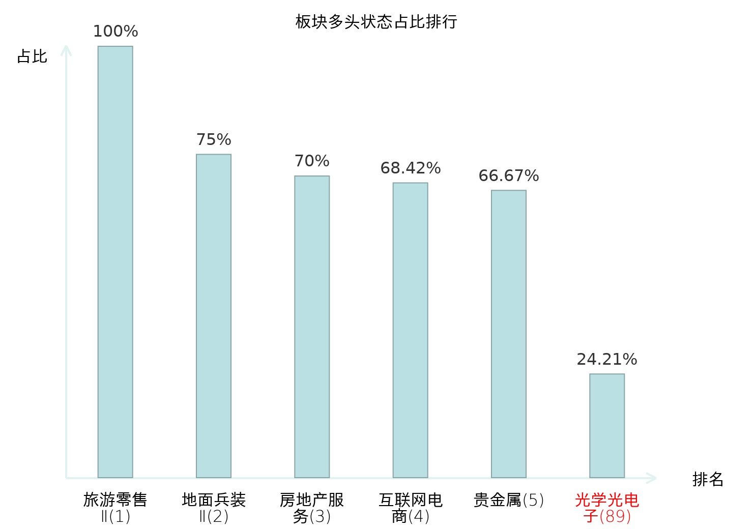 全市场所有行业板块中主力多头状态占比排名中,旅游零售Ⅱ板块位居第一。白色家电板块名次提升最快,较昨日上升65位。