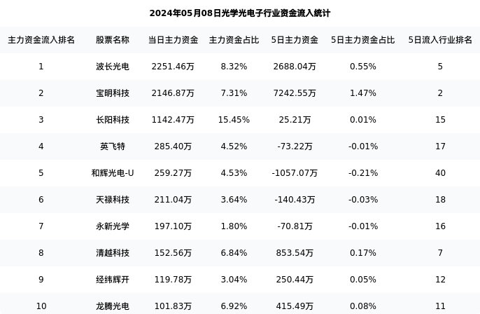 从主力资金流向来看,光学光电子行业今日主力资金流入39.39亿元,在所有申万二级行业中排名:96/131。