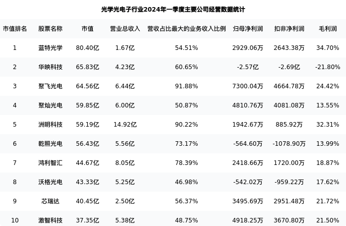 洲明科技最新报告期数据为一季度,下表汇总了光学光电子行业内市值靠前的公司一季度主要经营数据