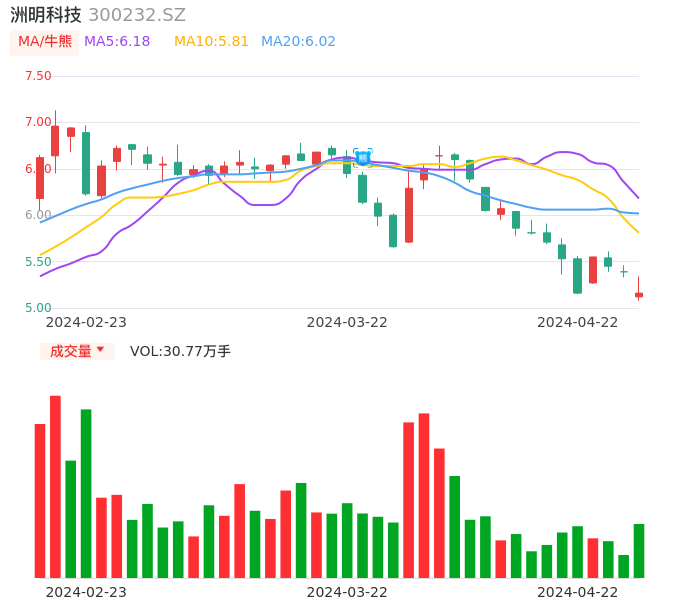 04月22日,洲明科技收报5.16,股价涨幅-4.27%,成交金额1.60亿元,换手率3.46%。