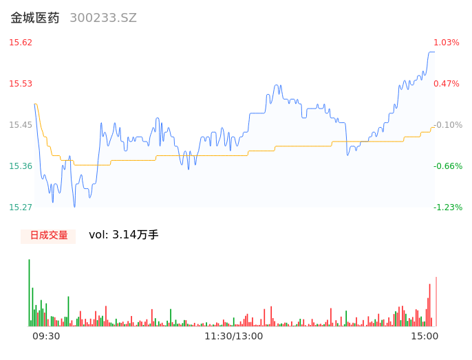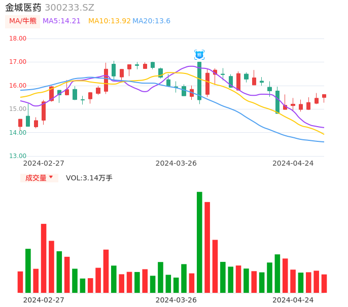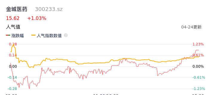 04月24日,金城医药收报15.62,股价涨幅1.03%,成交金额4855.85万元,换手率0.85%。