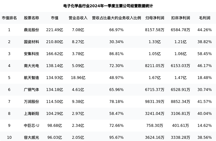 上海新阳最新报告期数据为一季度,下表汇总了电子化学品行业内市值靠前的公司一季度主要经营数据