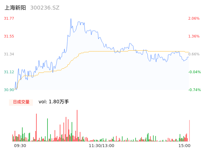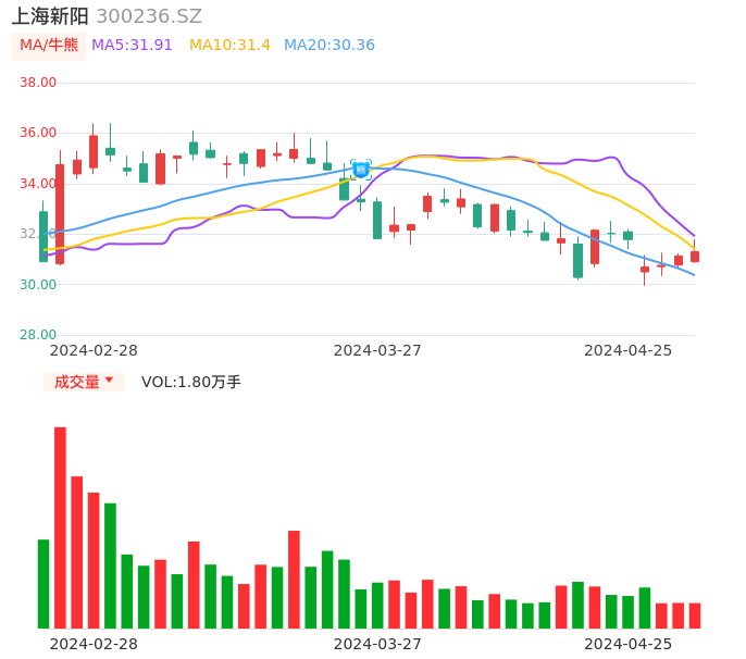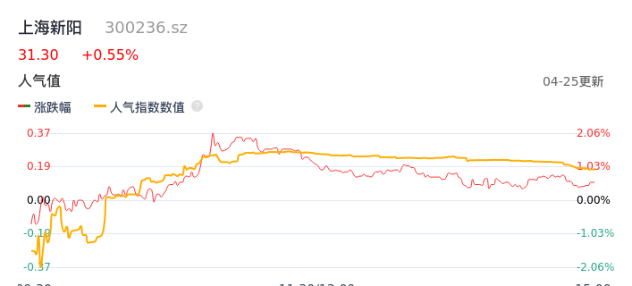 04月25日,上海新阳收报31.30,股价涨幅0.55%,成交金额5647.36万元,换手率0.65%。