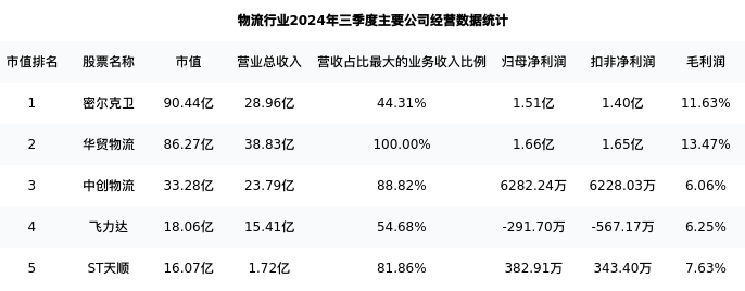 飞力达最新报告期数据为三季度,下表汇总了物流行业内市值靠前的公司三季度主要经营数据