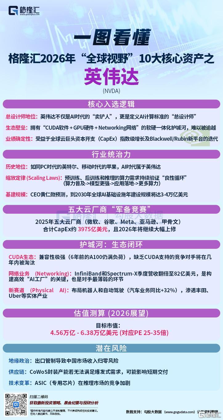 与此同时,入选2026年格隆汇“全球视野”十大核心资产的英伟达微涨0.04%,在2025年成为首家市值突破5万亿美元的企业。