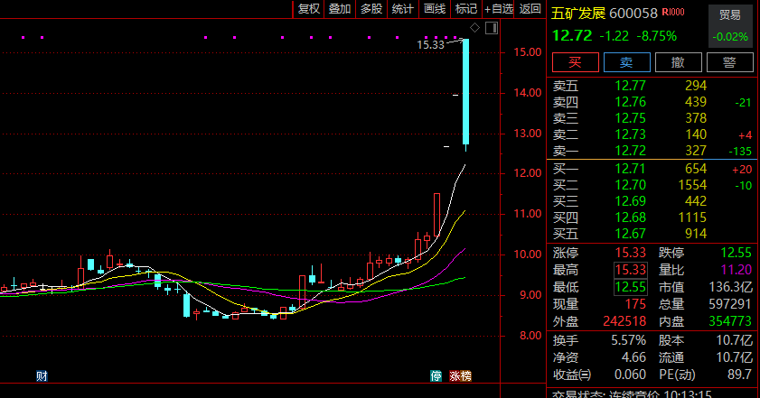 五矿发展(600058)盘中上演“天地板”。此前三个交易日,公司股票连续涨停。