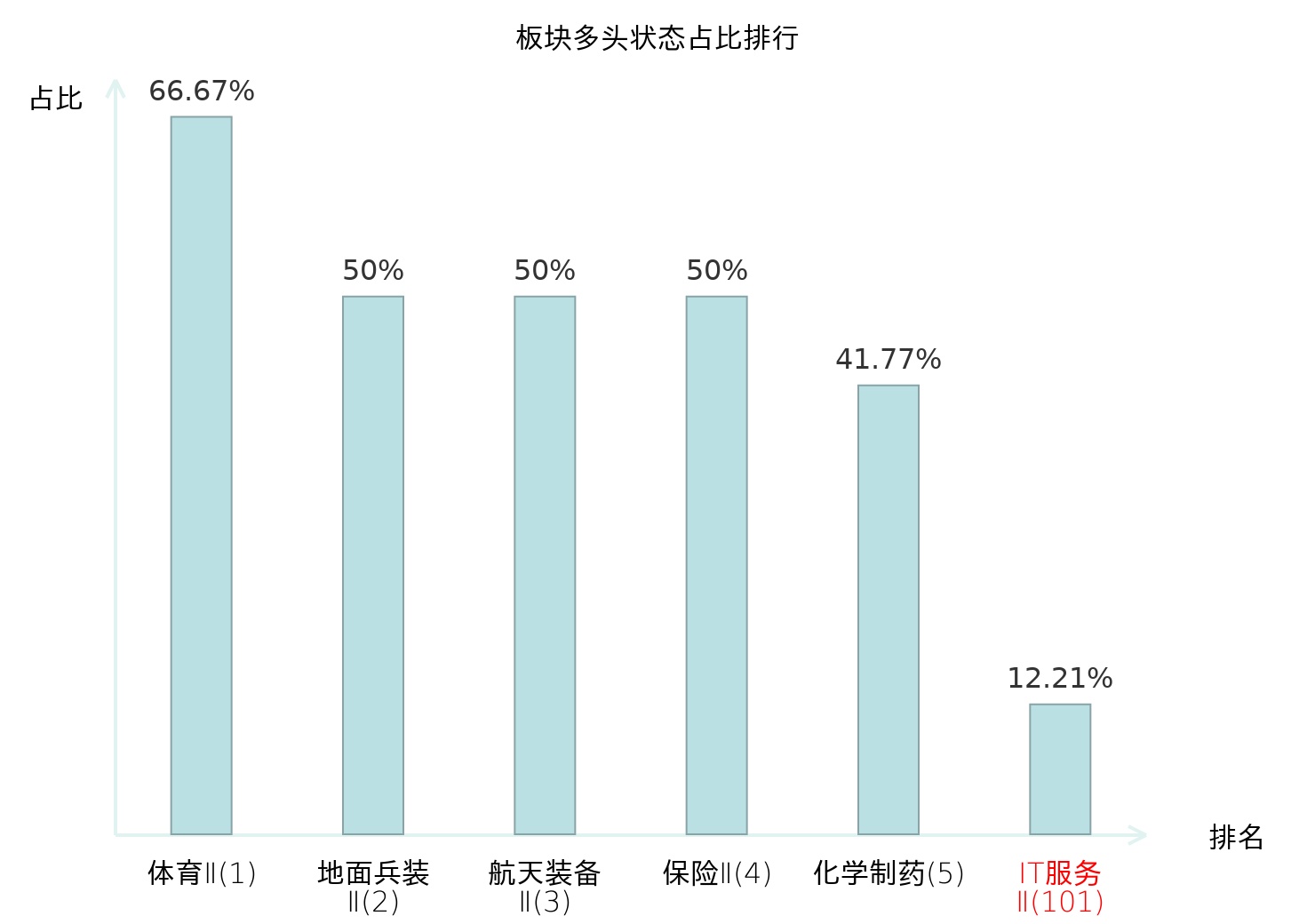 全市场所有行业板块中主力多头状态占比排名中,体育Ⅱ板块位居第一。普钢板块名次提升最快,较昨日上升98位。