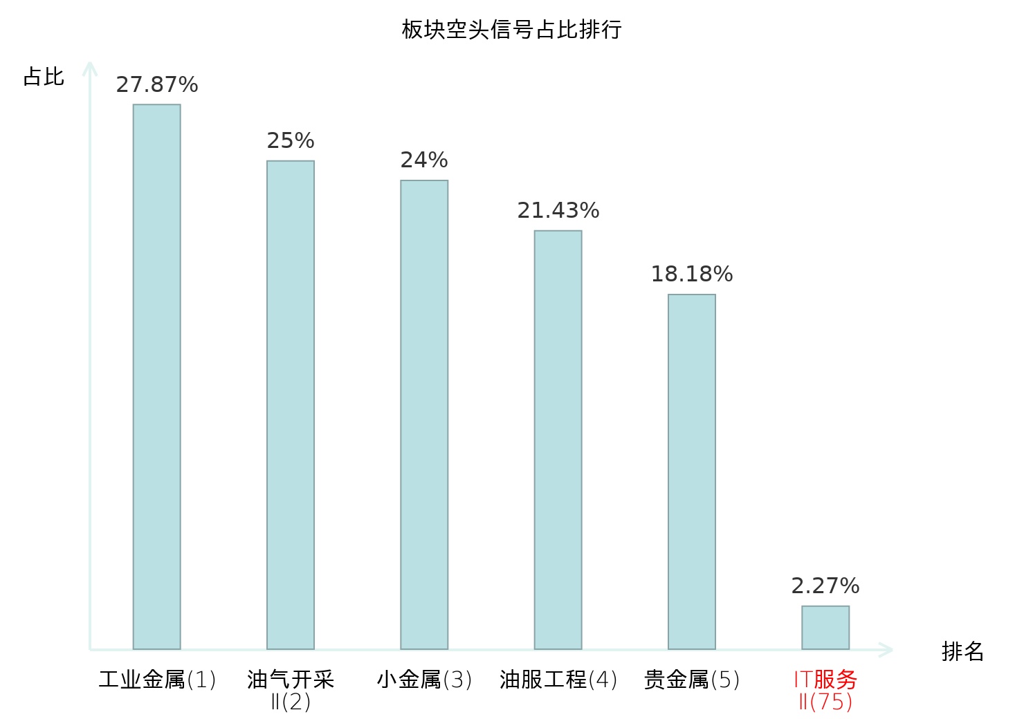 全市场所有行业板块中主力空头信号占比排名中,工业金属板块位居第一。饲料板块名次提升最快,较昨日上升112位。