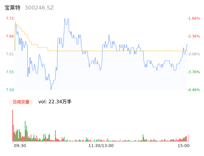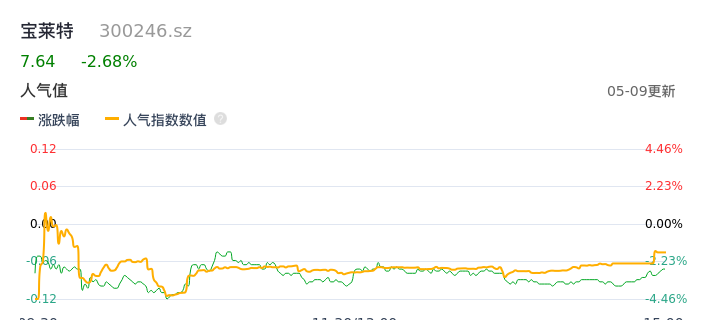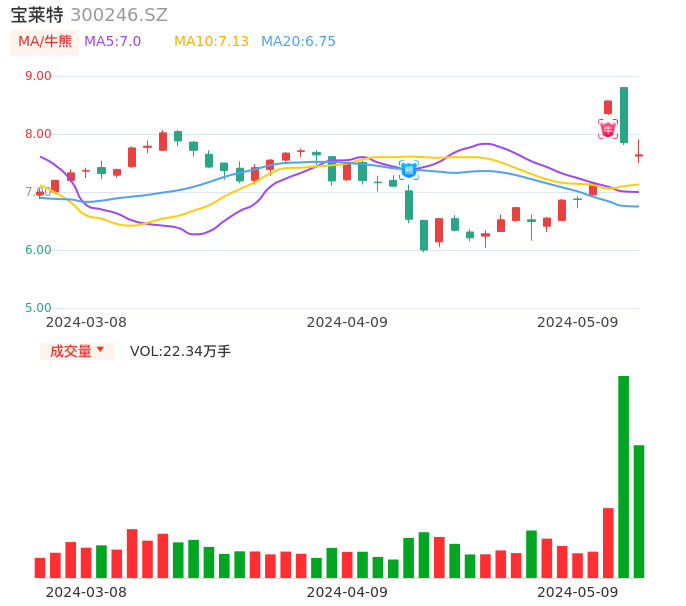 05月09日,宝莱特收报7.64,股价涨幅-2.68%,成交金额1.70亿元,换手率10.57%。