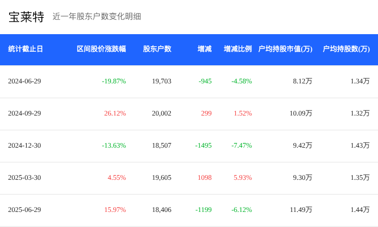 宝莱特(300246)在2025年第二季度的股东户数变化显示,截至2025年6月30日,公司股东户数为1.84万户,较上期(2025年3月31日)减少6.12%,股东户数减少表明公司筹码集中度有所提升。同时,户均持股数量环比增长6.51%,户均持股市值增长23.52%,达到11.49万元。这表明每股的平均持有量增加,投资者持有宝莱特的意愿增强。