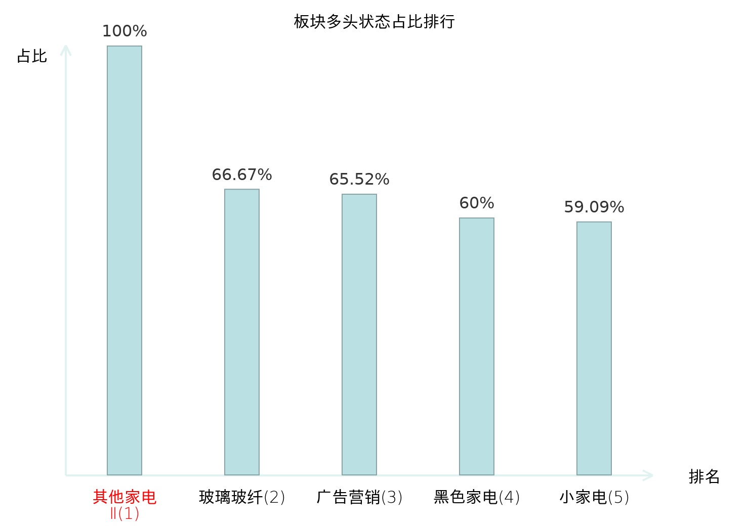 全市场所有行业板块中主力多头状态占比排名中,其他家电Ⅱ板块位居第一。航天装备Ⅱ板块名次提升最快,较昨日上升79位。