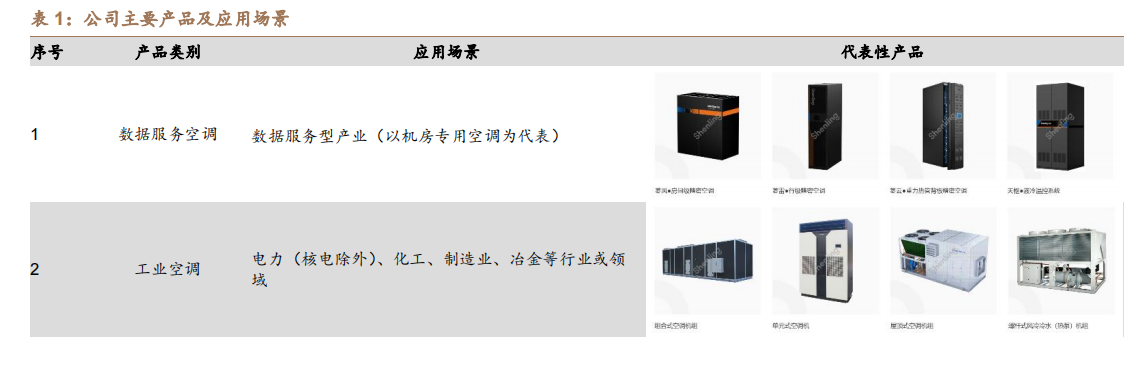 公司产品主要包括数据服务空调、工业空调、特种空调、公建及商用空调四大类。从下游客户分布来看,数据服务空调服务于信息通信产业,客户主要包括华为、曙光节能等;工业空调包括电力、化工、制造业、冶金等领域,主要客户为国家电网、南方电网等央企;特种空调包括核电、军工与航天、交通、医院医疗等领域;公建及商用空调包括公共建筑、大型商用、科研院所等领域。