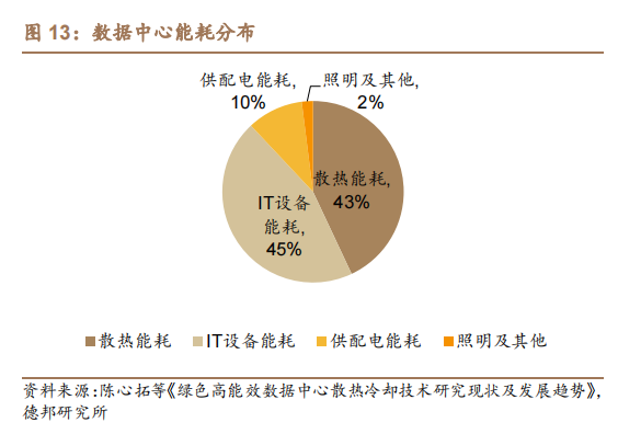 数据中心能耗中制散热能耗占比达到43%,是数据中心辅助能源中占比最高的部分,因此,降低散热系统能耗能够极大的促进PUE的降低。液冷作为数据中心新兴制冷技术,被应用于解决高功率密度机柜散热需求;与风冷系统相比,液冷方案利用液体的高导热、高传热特性