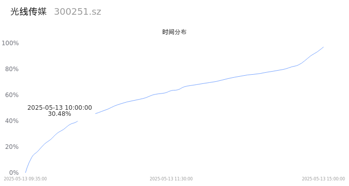 300251光线传媒2025年05月13日成交49.41万手,成交金额9.29亿,相较昨日缩量4247手,换手率1.78%,成交清淡。