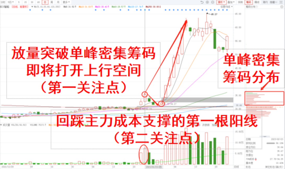 随着形成一波凌厉的大涨,突破的第一关注点和低吸回踩的第二关注点后,一波趋势上行。(期间涨幅达到118%)