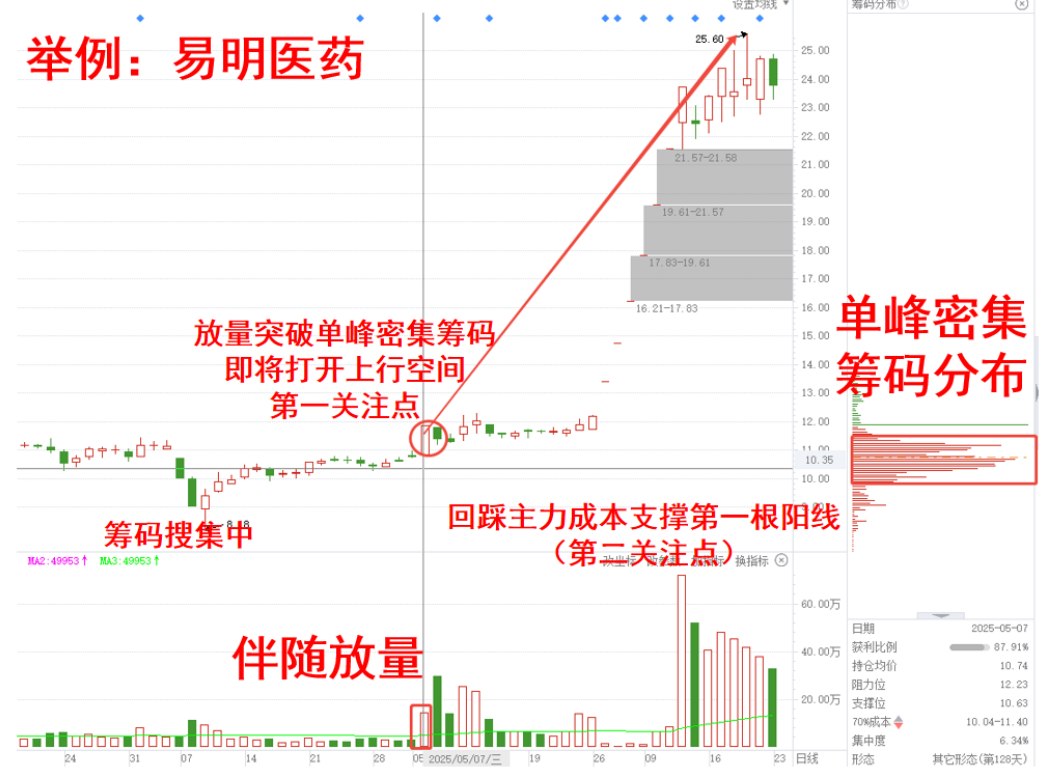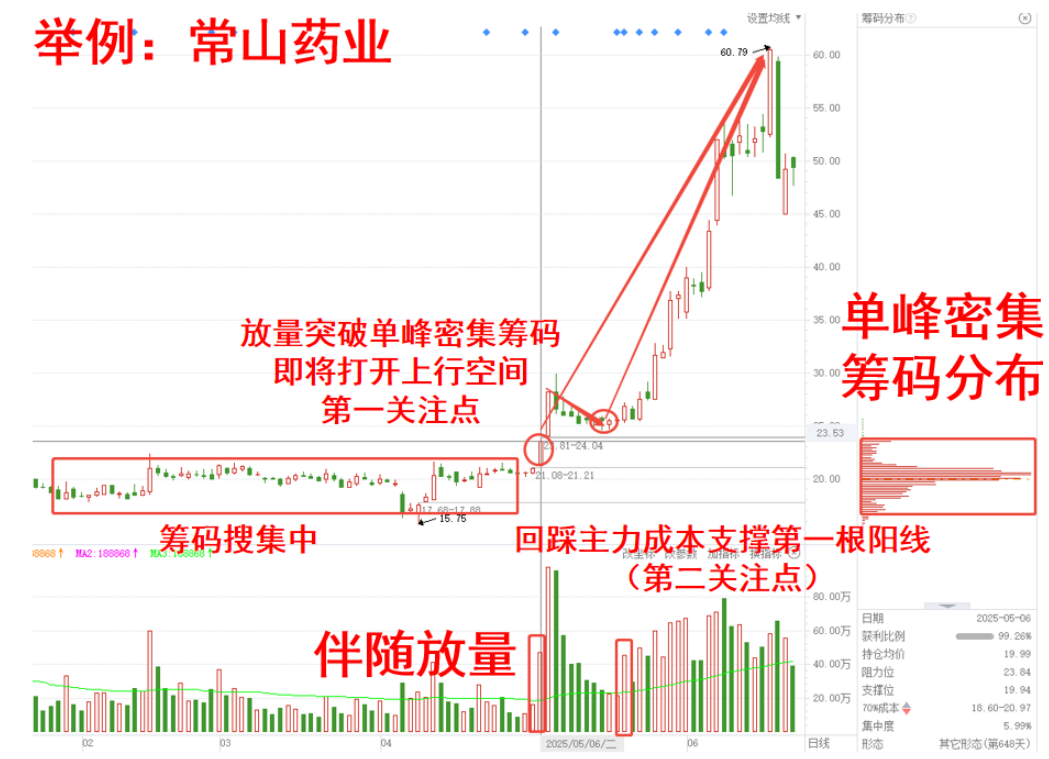 未有上涨前,筹码分散,属于主力资金的搜集筹码中,随后突破大涨,在2025年5月6日,倍量大涨,形成密集单峰筹码形态,也迎来第一关注点。