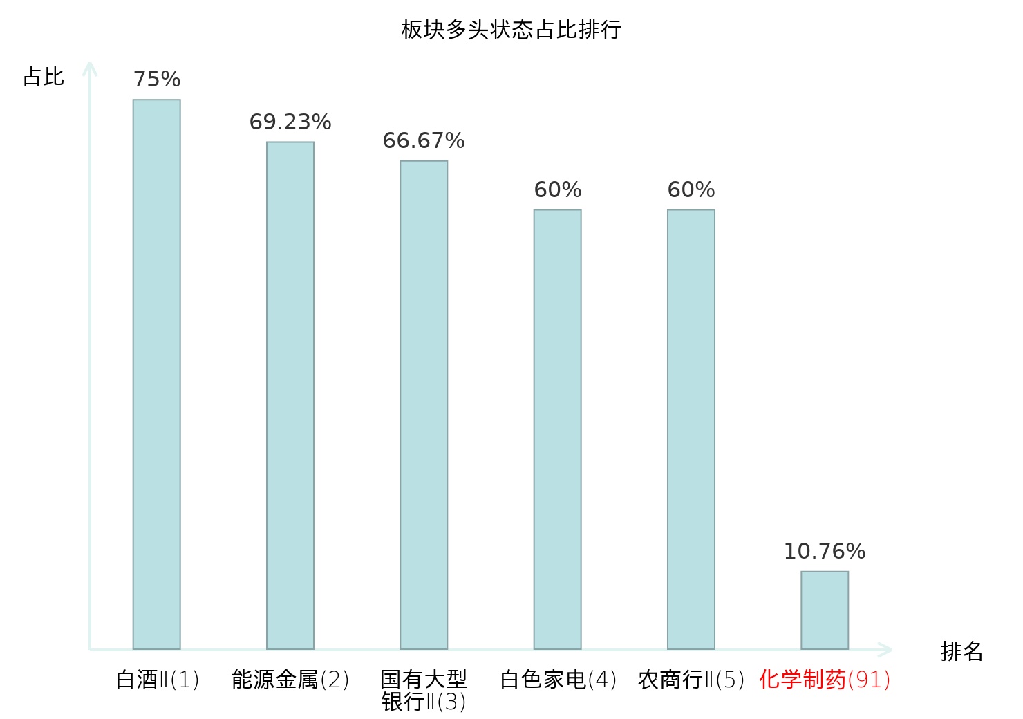 全市场所有行业板块中主力多头状态占比排名中,白酒Ⅱ板块位居第一。房地产服务板块名次提升最快,较昨日上升86位。