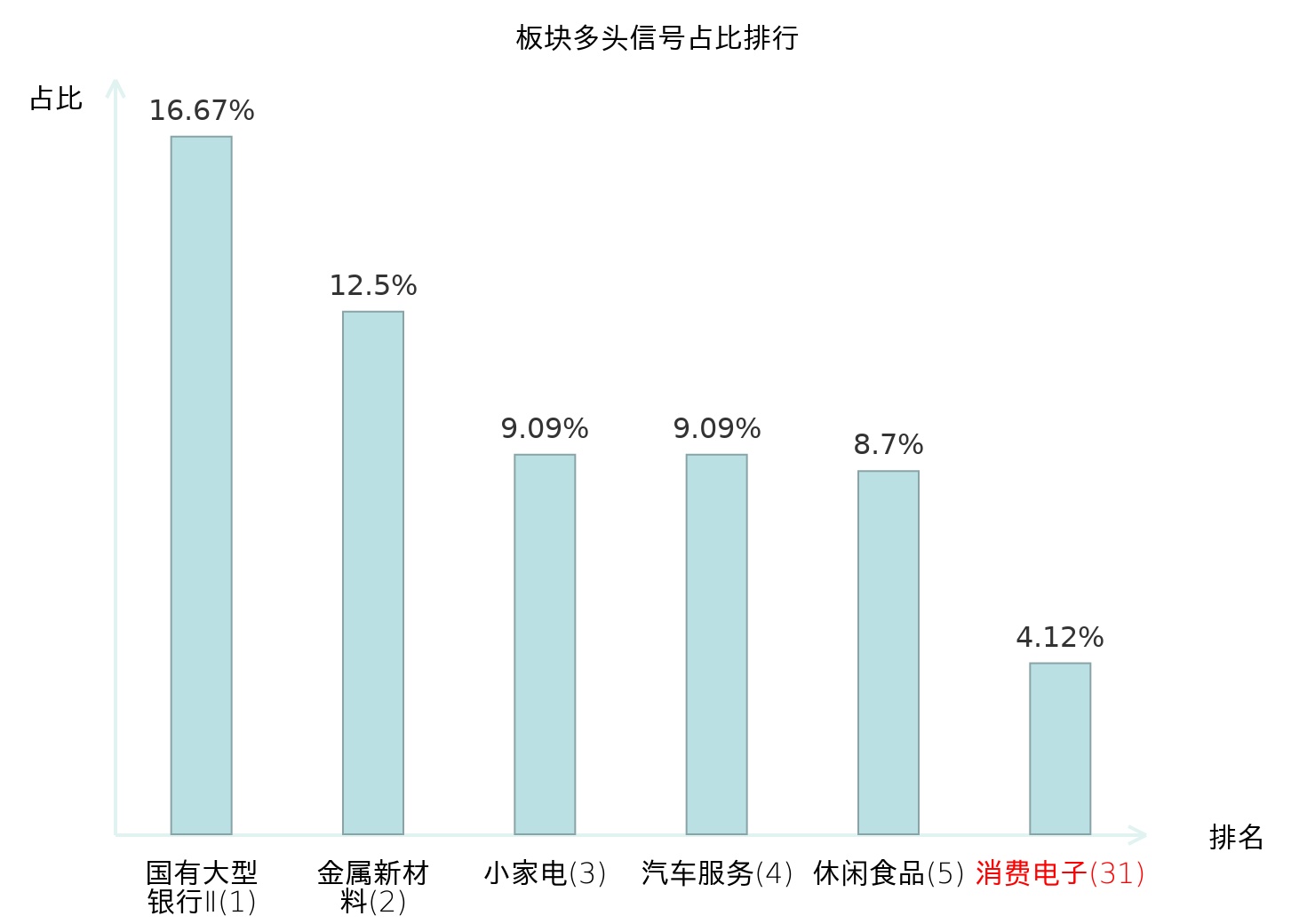 全市场所有行业板块中主力多头信号占比排名中,国有大型银行Ⅱ板块位居第一。汽车服务板块名次提升最快,较昨日上升109位。