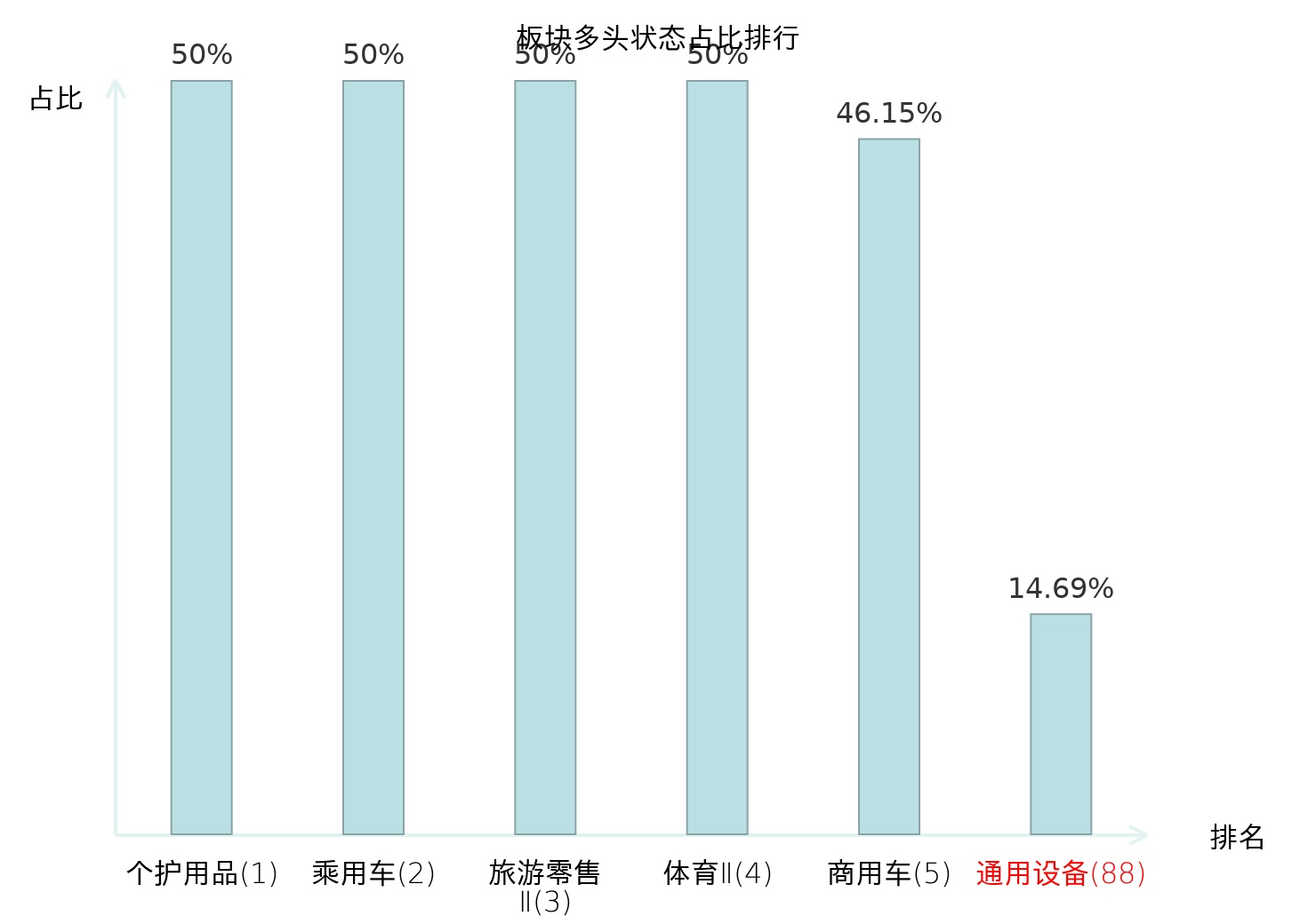 全市场所有行业板块中主力多头状态占比排名中,个护用品板块位居第一。林业Ⅱ板块名次提升最快,较昨日上升94位。