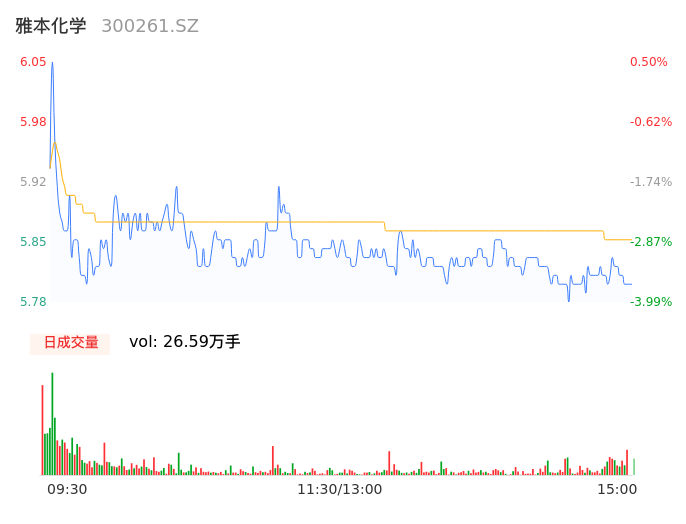 04月22日,雅本化学收报5.79,股价涨幅-3.82%,成交金额1.56亿元,换手率2.84%。