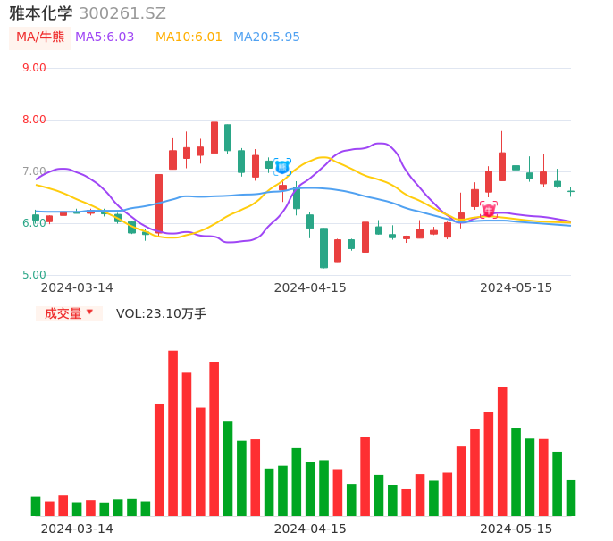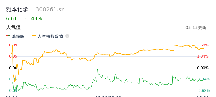 05月15日,雅本化学收报6.61,股价涨幅-1.49%,成交金额1.52亿元,换手率2.46%。