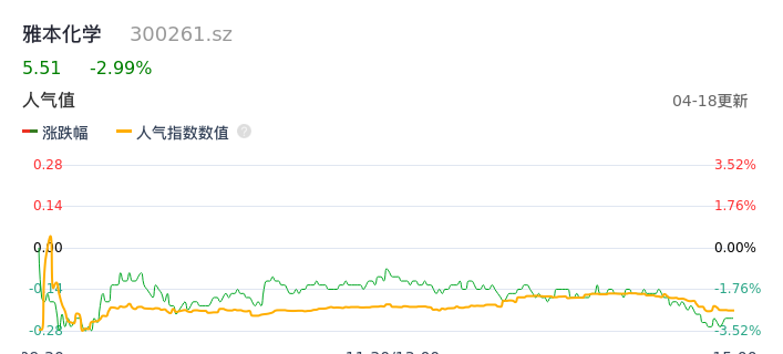04月18日,雅本化学收报5.51,股价涨幅-2.99%,成交金额1.15亿元,换手率2.21%。