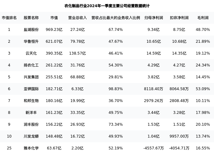 雅本化学最新报告期数据为一季度,下表汇总了农化制品行业内市值靠前的公司一季度主要经营数据