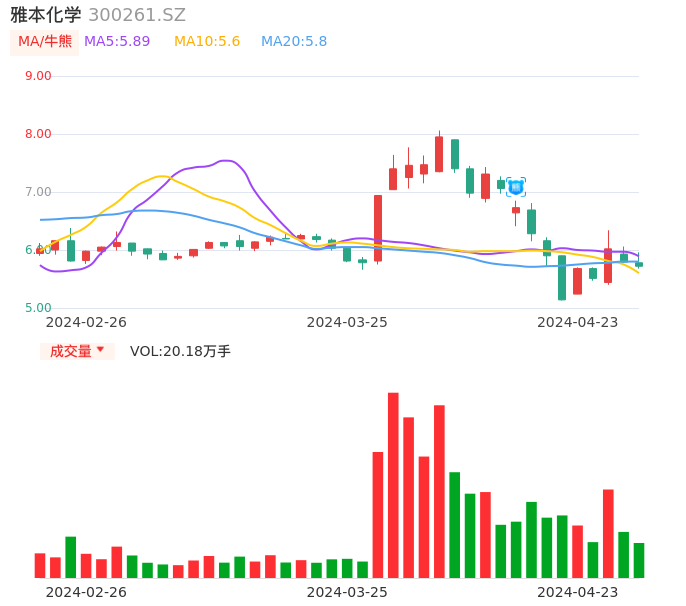 04月23日,雅本化学收报5.72,股价涨幅-1.21%,成交金额1.17亿元,换手率2.15%。