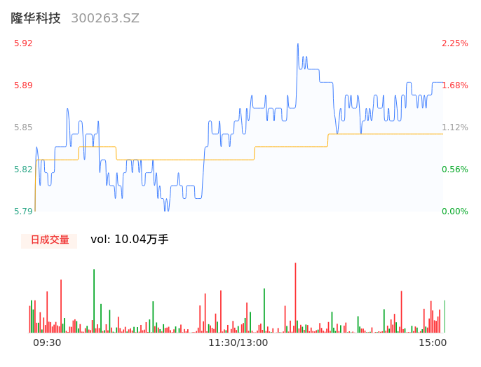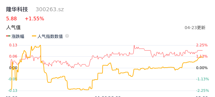 04月23日,隆华科技收报5.88,股价涨幅1.55%,成交金额5873.01万元,换手率1.30%。