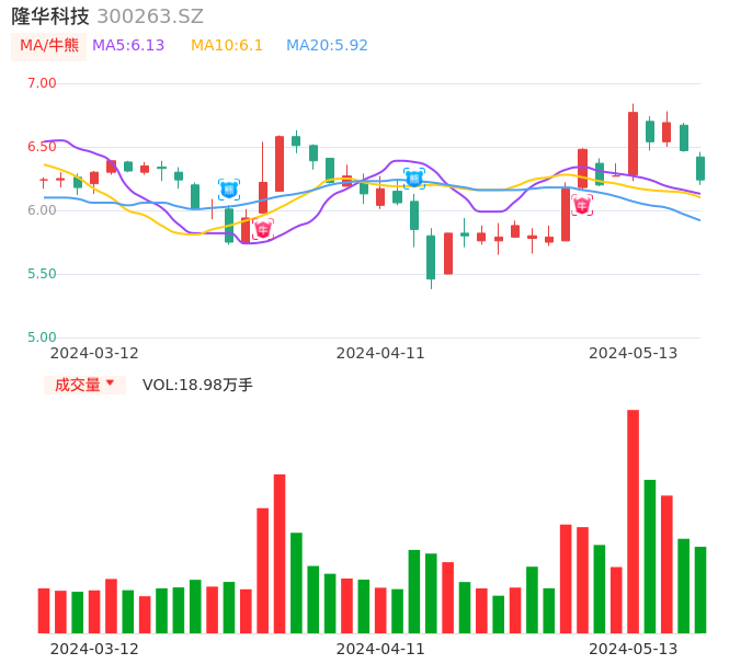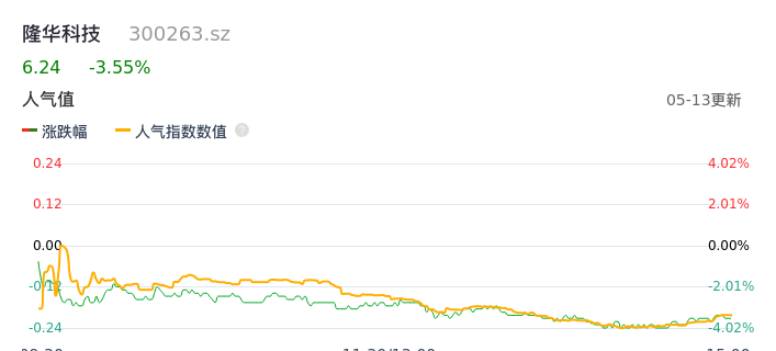 05月13日,隆华科技收报6.24,股价涨幅-3.55%,成交金额1.19亿元,换手率2.46%。