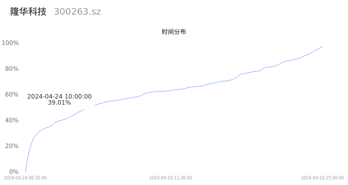 首先我们来看当日成交的时间分布。将今日交易时间按照5分钟的时间间隔进行切片,并绘制分布直方图进行观察。可以发现,10点之前的成交量占全天成交量的39.01%,这说明,该股票活跃时段换手火爆,资金热情高涨。