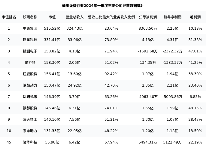 隆华科技最新报告期数据为一季度,下表汇总了通用设备行业内市值靠前的公司一季度主要经营数据