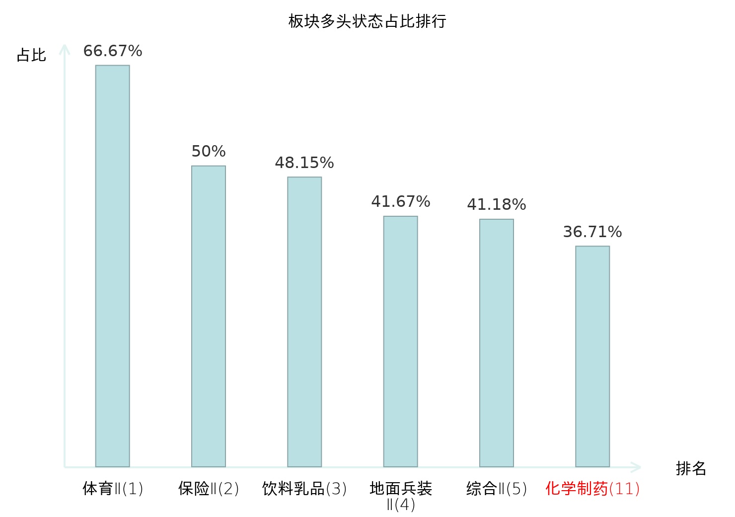 全市场所有行业板块中主力多头状态占比排名中,体育Ⅱ板块位居第一。种植业板块名次提升最快,较昨日上升70位。