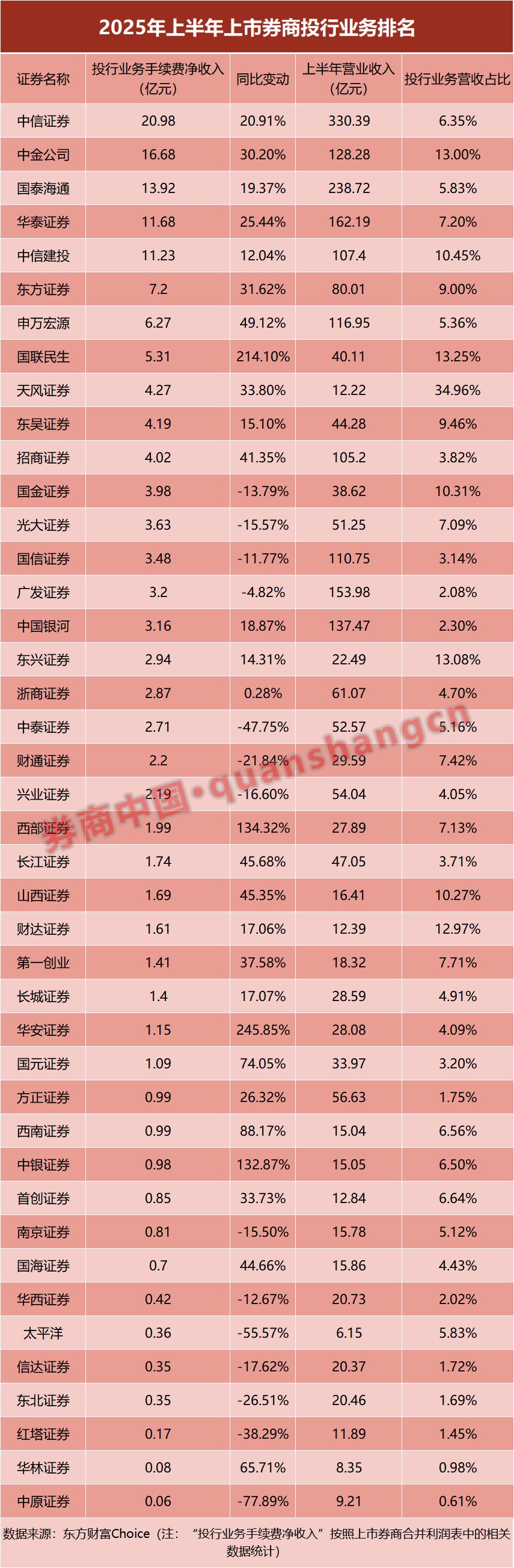 随着上市券商半年报披露完毕,券商投行业务最新排名出炉。
